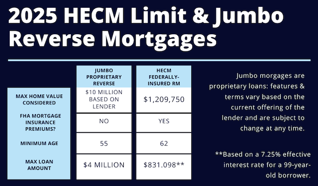 Many Financial Planners recommend the jumbo reverse as a tool that allows their senior clients to tap into considerably more of their home’s value. A jumbo reverse mortgage is designed for homeowners of higher-valued properties that exceed the maximum value that FHA will consider when calculating a loan amount ($1,209,750), helping them access a larger portion of their home’s value. Those over the age of 55 or 60 with significant equity in a more expensive home are ideal candidates for a jumbo reverse mortgage.